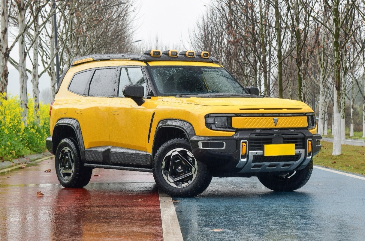 深蓝G318走的是机甲风路线,融合了赛博美学与机甲风格。方盒子的车头搭配粗犷又不失精致的前保险杠,半环形的 LED 灯带增添了未来感。车身侧面有隐藏式门把手、“原石切割” 风格轮圈,车尾配备 “能量晶体” 尾灯和外挂式备胎,整体呈现出满满的硬核装甲风。