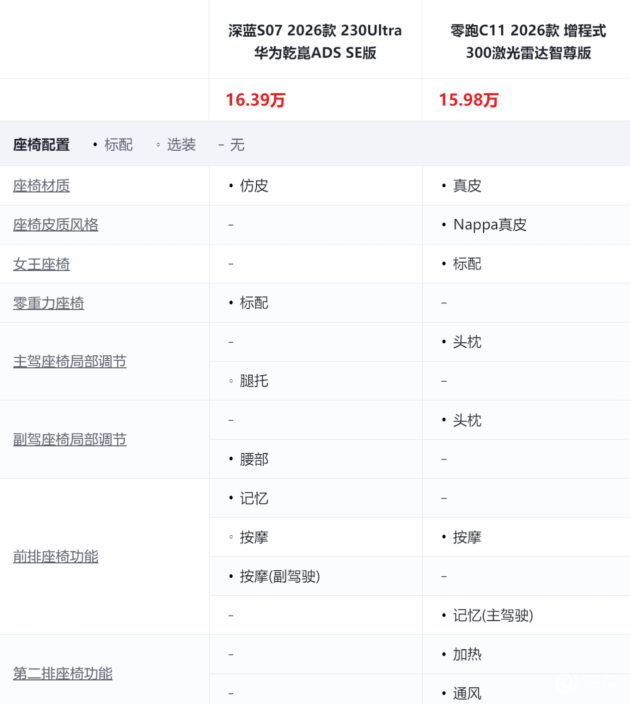 当然说的这些作为家用车,除了空间和尺寸之外,各方面的舒适性配置也是非常关键的。在这里,零跑C11的优势它还是比较明显的,比如C11使用的是Nappa真皮,而不是对手的仿皮,女王座椅和零重力座椅也算打了个平手。不仅如此,零跑C11的第2排居然也可以实现靠背角度调节,甚至还有这个级别非常罕见的加热和通风,一个在冬天很好用,一个在夏天很好用。而深蓝S07的副驾功能稍多一些,但是对于家庭而言,最为重要的后排照顾却不到位,足以见到零跑C11的高瞻远瞩。