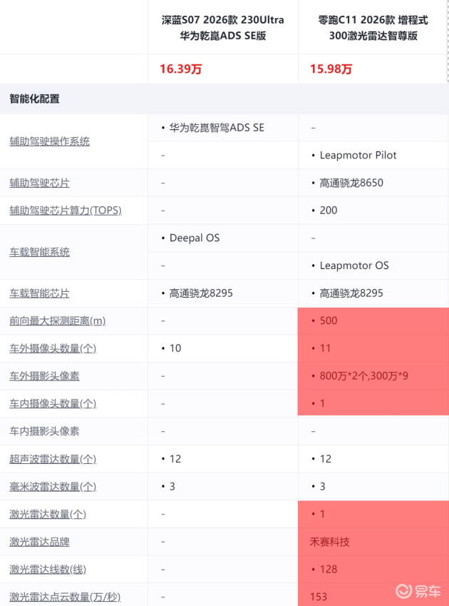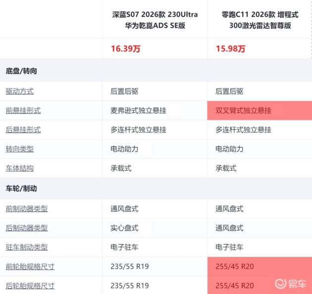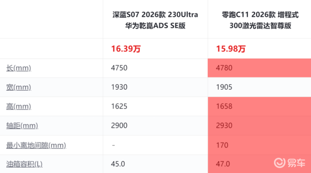 咱们选择这两款车,分别是零跑C11 2026款增程式300激光雷达智尊版,官方指导价格15.98万,深蓝S07是2026款230Ultra华为ADS SE版,官方指导价格是16.69万,但是目前有优惠,实际的经销商报价16.39万,比C11贵了大约4100块钱,能充几年的电。由于价格类似,尺寸定位也都类似,所以它们简直太适合对比了。第1个事儿咱们就是对比这个级别消费者比较看重的尺寸和空间,得有肚量。