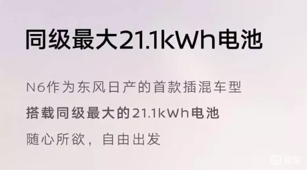 值得一提的是,日产官方表示N6所配备的21.1kWh电池包容量为同级最大,工信部申报的纯电续航里程为125km和130km,CLTC纯电续航超过150km。虽然标称的续航水平与秦L等车型没有明显差距,但电池容量显著更高。