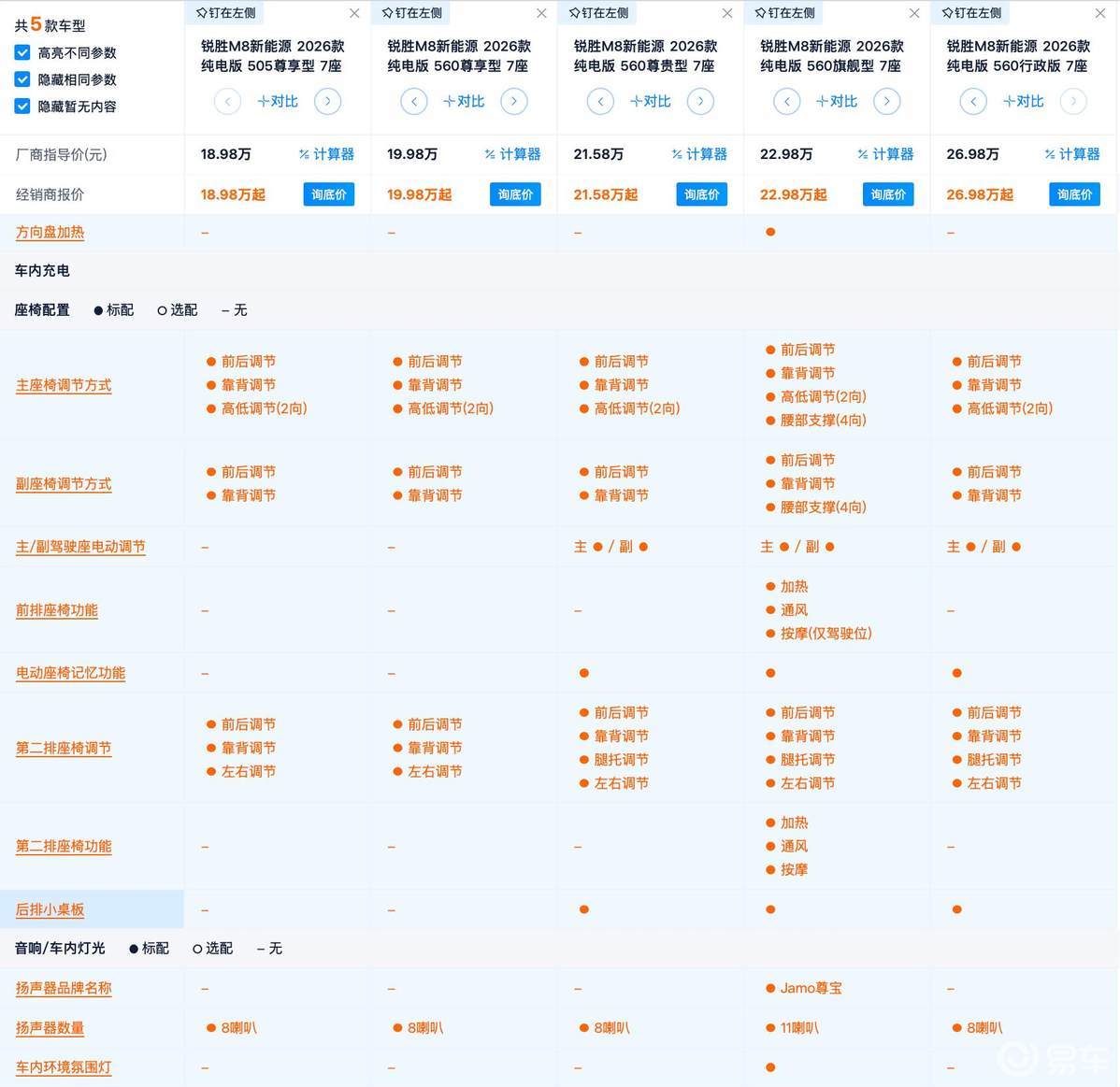 所以纯电7座常规版的车型来看,锐胜M8最具性价比的还是权益后16.98万的92kWh 长续航尊享型。