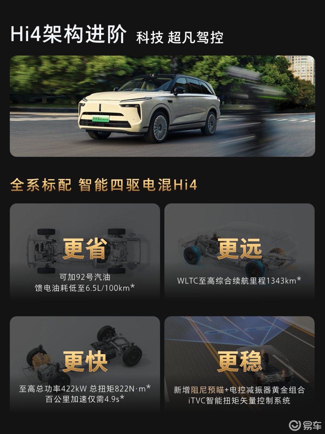 有了聪明的“大脑”来观察和决策,还得有强健的“体魄”来配合。全新蓝山智能进阶版搭载了Hi4性能版智能四驱电混系统。
