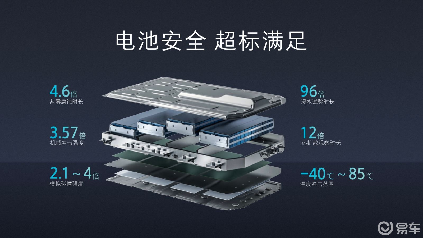 电池安全更是经过了严苛的测试。它的电池包接受的模拟碰撞测试,加速度达到国标的两倍;盐雾腐蚀测试的时间接近国标的五倍;热扩散观察时间是国标的十二倍;而浸水测试时间,甚至是国标的九十六倍。这些远超标准的测试,都是为了确保电池在各种极端情况下的安全。