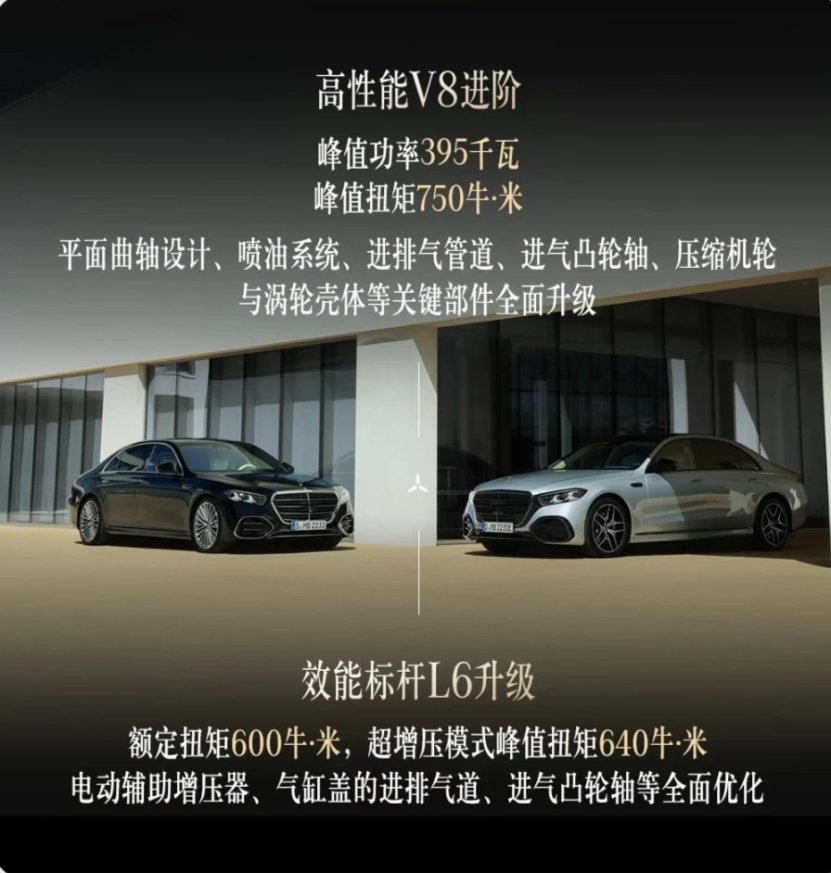 直六引擎(S450/S500):搭载升级版M256 Evo 3.0T直列六缸发动机,匹配48V轻混系统。S500车型的扭矩提升至600牛·米,且在超增压模式下可短暂爆发至640牛·米。