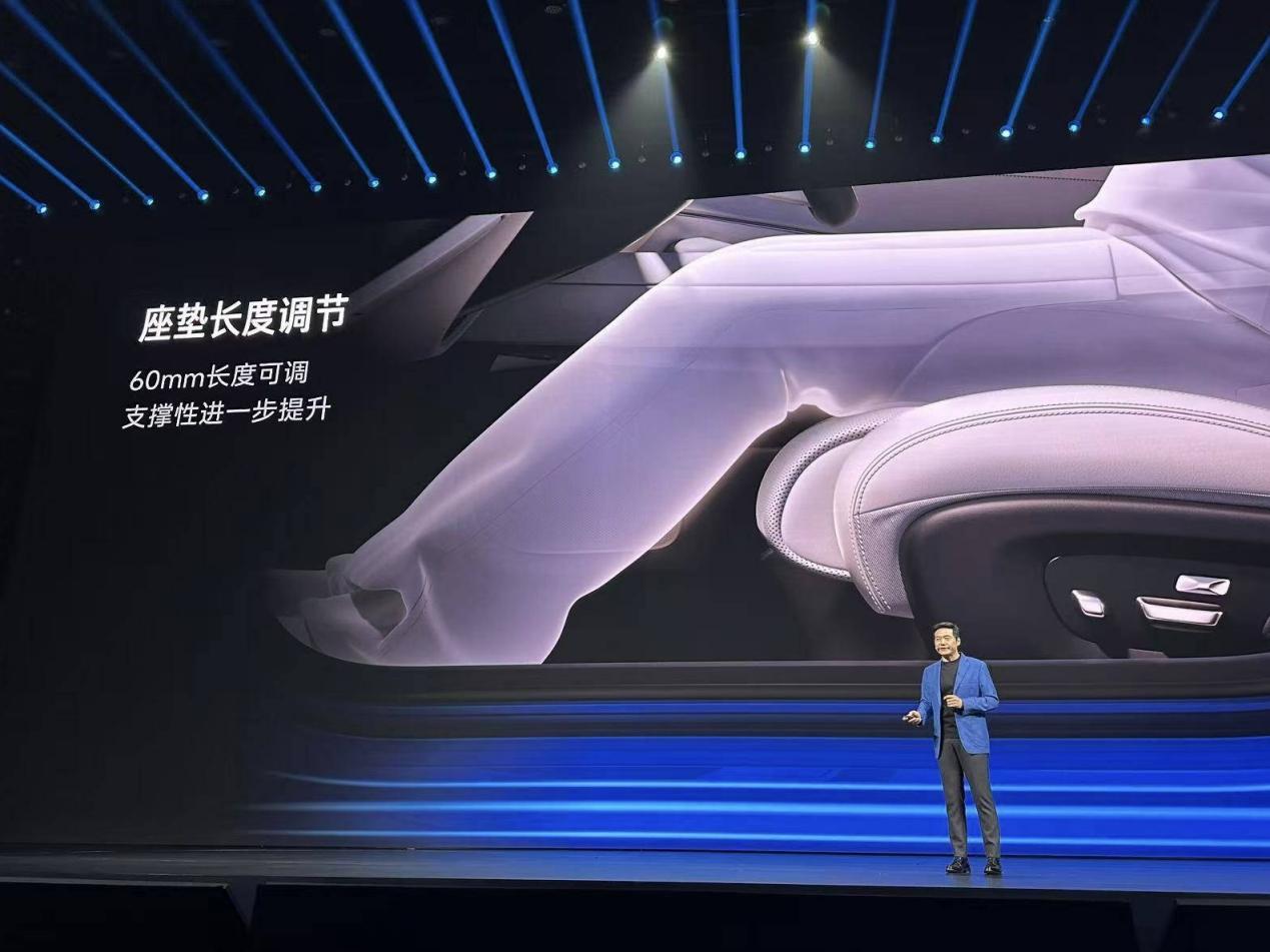 车内是小米澎湃智能座舱,中控台由16.1英寸中控屏+7.1英寸旋转液晶仪表+HUD抬头显示组成。主驾座椅标配18向电动调节,副驾配零重力座椅,腿托一升,直接躺平。