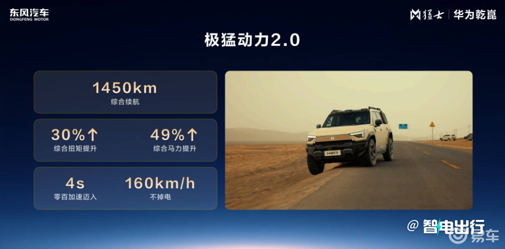 极猛动力2.0完成优化,综合马力、扭矩大幅提升,零百加速进入4秒区间,综合续航达1450公里,同时改善越野车型能耗偏高的问题。