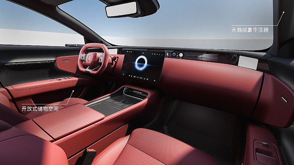 内饰方面,阿维塔12采用阿维塔标志性的GentleTech极简设计理念,大面积软质材质包覆搭配NAPPA真皮、木饰板与天鹅绒地毯,将豪华感与实用性推向了新的高度。